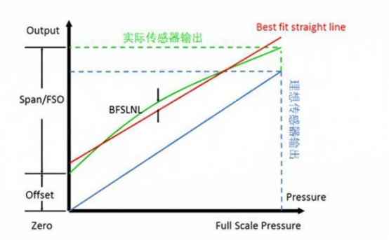 图-2硅阻压力传感器在固定温度下的输出曲线(绿色)特性与理想压力传感器输出曲线(蓝色)比较