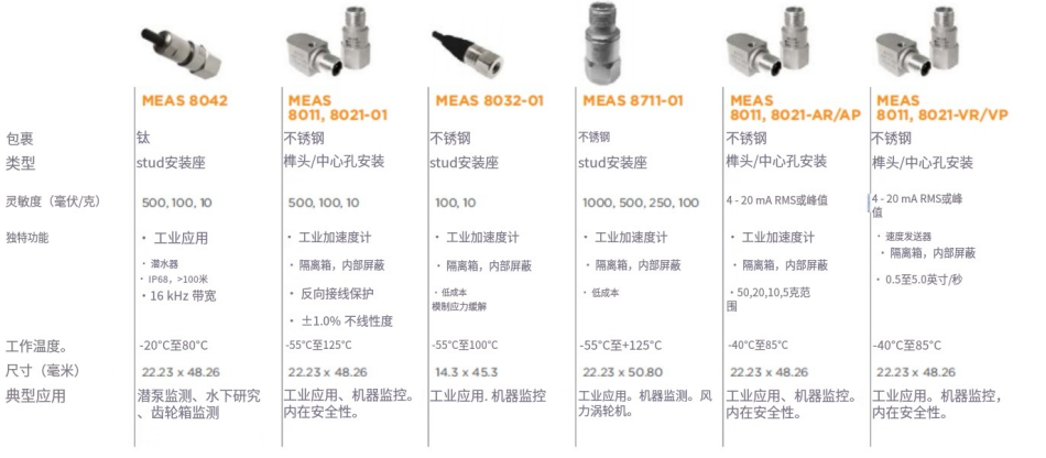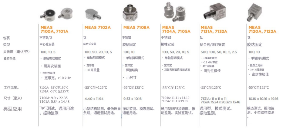 TE公司二十多年来一直致力于加速度计的设计与制造 基于自主研发的微机电系统(MEMS)、键合式应变片及压电陶瓷/薄膜技术,我们提供多种解决方案。 电压模式压电加速度计凭借其高输出电平和宽频带特性,成为行业主流设计。我们提供传统三线式和双线 式(IEPE)两种配置的电压模式加速度计。电荷模式压电加速度计专为高温环境下的冲击与振动测量而 设计,不仅具备卓越的高温运行性能,配合优质电荷放大器使用时还能实现动态范围的灵活扩展。若需精 准测量运动参数(如速度、位移),则需采用具备直流响应功能的加速度计。通过整合MEMS技术与最新 模拟/数字ASIC芯片,我们的直流加速度计在性能与性价比方面均表现卓越。所有产品均符合EAR99认证 标准及RoHS环保法规要求。
